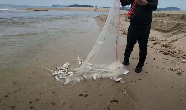 영상엔 강원도 양양 해변에서 투망질로 전어를 낚는 모습을 담은 장면이 담겨 있다. 투망질 한 번에 어림 봐도 20마리가 넘는 전어가 낚이는 걸 알 수 있다. 손바닥 길이보다 긴 큼지막한 크기도 눈길을 끈다. 살이 통통하게 오른 전어들을 모습이 전어 마니아들의 군침을 돌게 할 만하다.