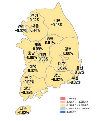 전국 아파트 가격은 0.01% 상승해 3주 연속 같은 상승세를 보였다. 지방 아파트 가격은 0.03% 하락했다. 전주(-0.02%) 대비 하락폭이 커졌다. 대구광역시는 0.07%, 대전광역시는 0.03% 하락하며 전주(-0.10%, -0.06%) 대비 하락폭이 축소됐다.