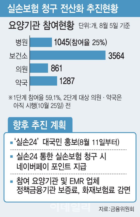 보건소 3564개를 제외하고 병원만 놓고 보면 4238곳 중 1045곳만 참여하고 있다. 참여율이 24.7% 저조한 수준이다. 다만 금융위 관계자는 “정신병원, 치과병원 등 실손보험 청구가 많지 않은 곳들도 포함된 거라 25%라는 수치가 소비자 효용을 의미하는 것은 아니다”라고 했다. 오는 10월 25일부터 2단계 확대 대상이 되는 의원·약국(약 9만6000개)도 온누리약국·위드팜약국 체인 등 약 2.2% 정도만이 선제적으로 참여했다.
