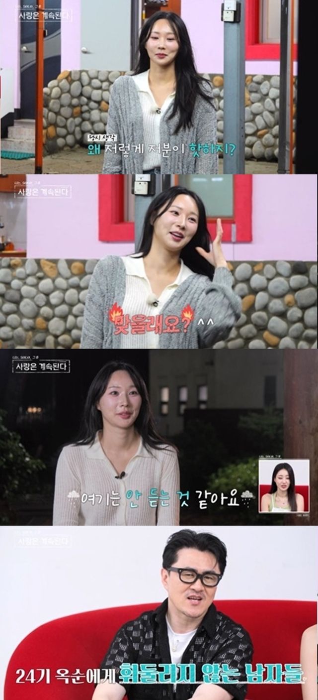 결국 24기 옥순은 "반응 좀 해주실래요?"라고 리액션 구걸(?)에 나서고, 직후 제작진과의 속마음 인터뷰에서 "예전에 '나는 SOLO' 때는 24기 남자들이 제가 말하면 다들 웃고 호응해 줬는데, 여기서는 (내 말을) 안 듣는 것 같다"며 속상해한다.