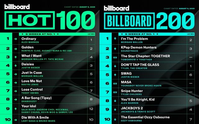 앨범 차트인 빌보드 200에서는 '케데헌'의 OST 앨범이 전주 대비 1계단 상승한 2위를 차지하면서 미국의 컨트리 가수 모건 월렌의 뒤를 바짝 뒤쫒고 있다.
