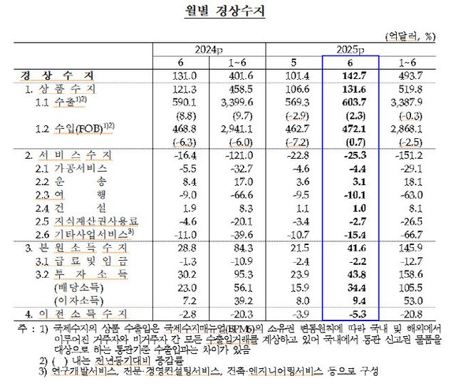 7일 한국은행이 발표한 ‘6월 국제수지(잠정)’에 따르면 올해 6월 경상수지는 142억 7000만달러 흑자를 기록했다. 이는 역대 최대 흑자이자, 5월(101억4000만달러)보다 41억 3000만달러 늘어나며 역대 최대 흑자 폭을 기록했다. 또 지난 2023년 5월(20억9000만 달러) 이후 26개월째 흑자를 이어갔고, 2000년대 들어 3번째 최장기간 연속 흑자다.