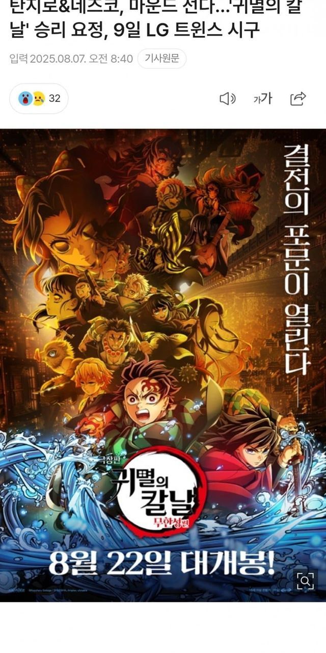 8월 9일 귀멸의 칼날 캐릭터가 잠실에서 시구를 한다하자