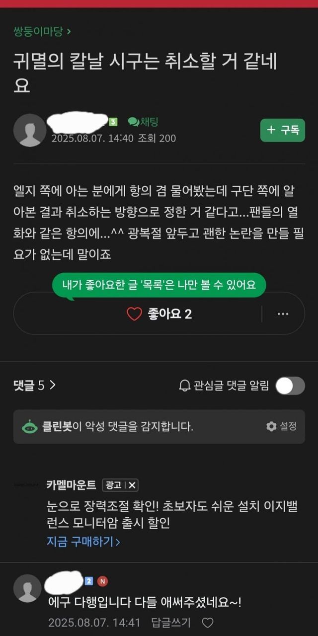 결국 LG 구단은 귀칼 시구를 취소하기로 결정