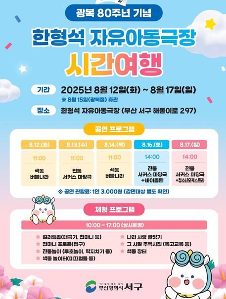 [파이낸셜경제=김영란 기자] 부산광역시 서구는 오는 8월 12일부터 17일까지(광복절 휴관) 한형석 자유아동극장에서‘광복 80주년 기념 한형석 자유아동극장 시간여행’을 개최한다.