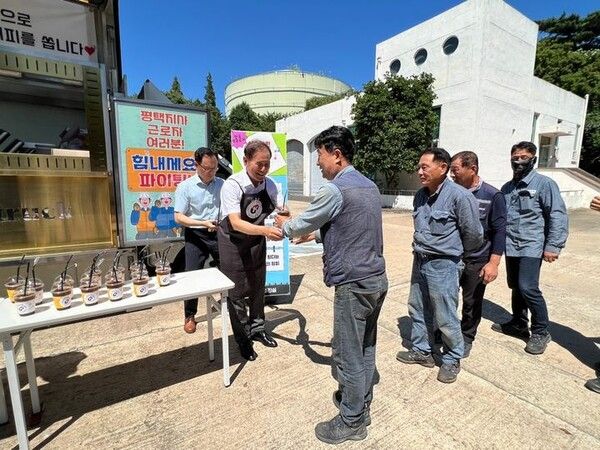 김 사장은 근로자에게 감사 인사를 전하고, 즉석에서 시원한 음료와 간식을 제공하는 '찾아가는 커피차' 이벤트를 진행했다.