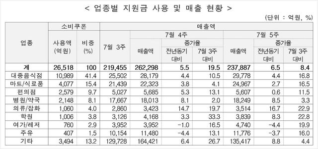 7월 5주(7월 28일~8월 3일) 매출액도 소비쿠폰 지급 전인 7월 3주 대비 8.4% 증가를 보였고, 전년 동기 대비로는 6.5% 상승했다.