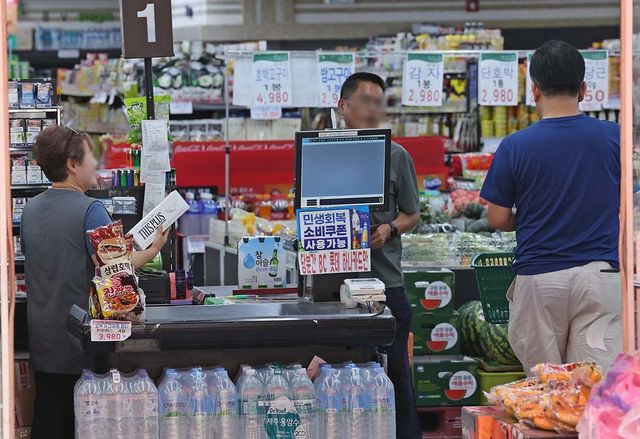 서울 마포구에 위치한 한 동네 슈퍼마켓에 민생회복 소비쿠폰 사용 안내 문구가 적혀 있다. / 뉴스1