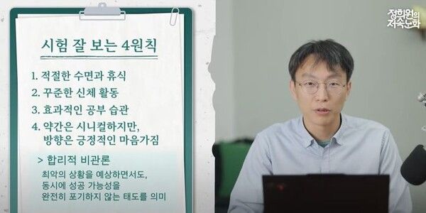 뉴시스 보도에 따르면, 5일 서울아산병원 전문의 정희원 교수는 유튜브 '정희원의 저속노화' 채널을 통해 "공부 잘하는 뇌 만드는 법"이라는 제목의 영상을 공개했다. 해당 영상에서 정 교수는 수험생들이 공부에 적합한 몸과 뇌 상태를 만들기 위한 4가지 원칙을 소개했다.