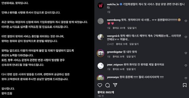 한편, 왓챠 인스타그램에는 왓챠를 응원하는 댓글이 달렸고, 좋아요 8603건(7일 오후 5시 53분 기준)을 기록했다. 누리꾼들은 “절대 사라지지마”, “왓챠 베타 테스트 때부터 계속 구독해왔는데 사라지면안된다”는 반응을 보였다.