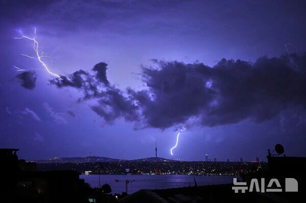 [서울=뉴시스] 7일(현지 시간) 튀르키예 이스탄불의 보스포루스 해협 상공에서 번개가 치고 있다.