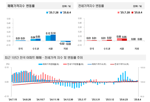 7일 한국부동산원은 8월 첫째주(4일 기준) 전국 주간 아파트 가격 동향 자료를 발표하고 금주 서울 아파트 가격이 0.14% 올랐다고 밝혔다. 전주 0.12% 대비 상승폭이 확대됐는데, 6·27 대출 규제 후 5주 연속 꺾이다 6주 차에 반등했다.