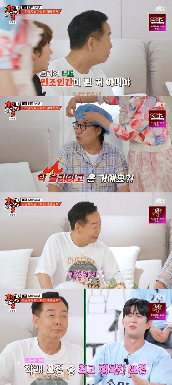 또 최양락은 "이걸 굳이 왜 얘기해서 이 시간에 오게 만들었냐"라며 팽현숙에게 화를 냈다. 이에 김학래는 "혈압 오르면 생착률이 50%로 떨어진다"라며 최양락을 진정시켰다.