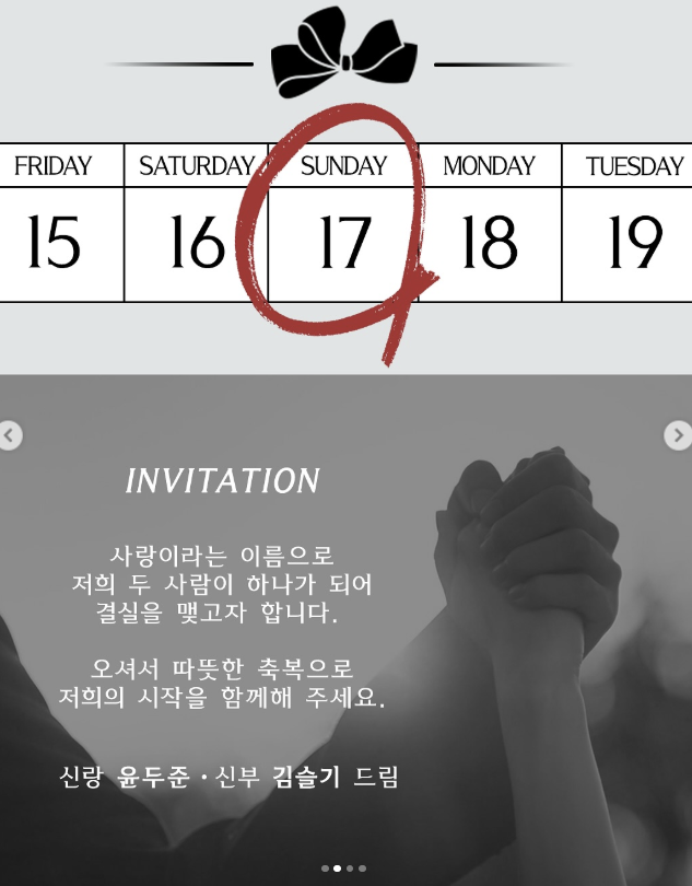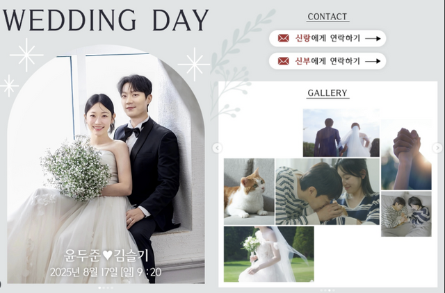 또 다른 사진에선 “사랑이라는 이름으로 저희 두 사람이 하나가 되어 결실을 맺고자 합니다. 오셔서 따뜻한 축복으로 저희의 시작을 함께해주세요. 신랑 윤두준, 신부 김슬기 드림”이라는 초대 문구가 담겨있고, 윤두준과 김슬기의 다정한 일상을 담은 사진도 첨부됐다.
