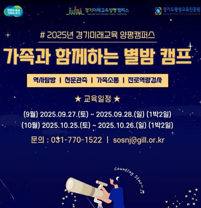 [파이낸셜경제=김영란 기자] 경기도평생교육진흥원 경기미래교육 양평캠퍼스(양평군 용문면 소재)는 9월 27~28일과 10월 25~26일 총 2회에 걸쳐 주말 1박 2일 일정으로 ‘가족과 함께하는 별밤캠프’를 진행한다며, 참가자를 선착순 모집한다.