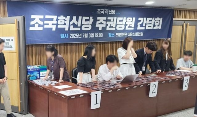 지난달 3일 국회에서 열린 조국혁신당 주권당원 간담회 모습. 서울 영등포경찰서는 지난 2일 조국혁신당 관계자 4명에 대한 상해 등 혐의 고소장을 접수해 조사에 착수한 것으로 알려졌다. 고소인인 60대 A 씨로 파악됐다. A 씨는 지난달 3일 국회에서 열린 조국혁신당 주권당원 간담회에 참석했다가 조국혁신당 관계자들로부터 3차례에 걸쳐 폭행당해 손목과 무릎 등을 다쳤다고 주장했다. / 연합뉴스