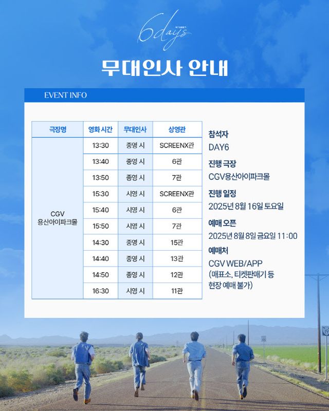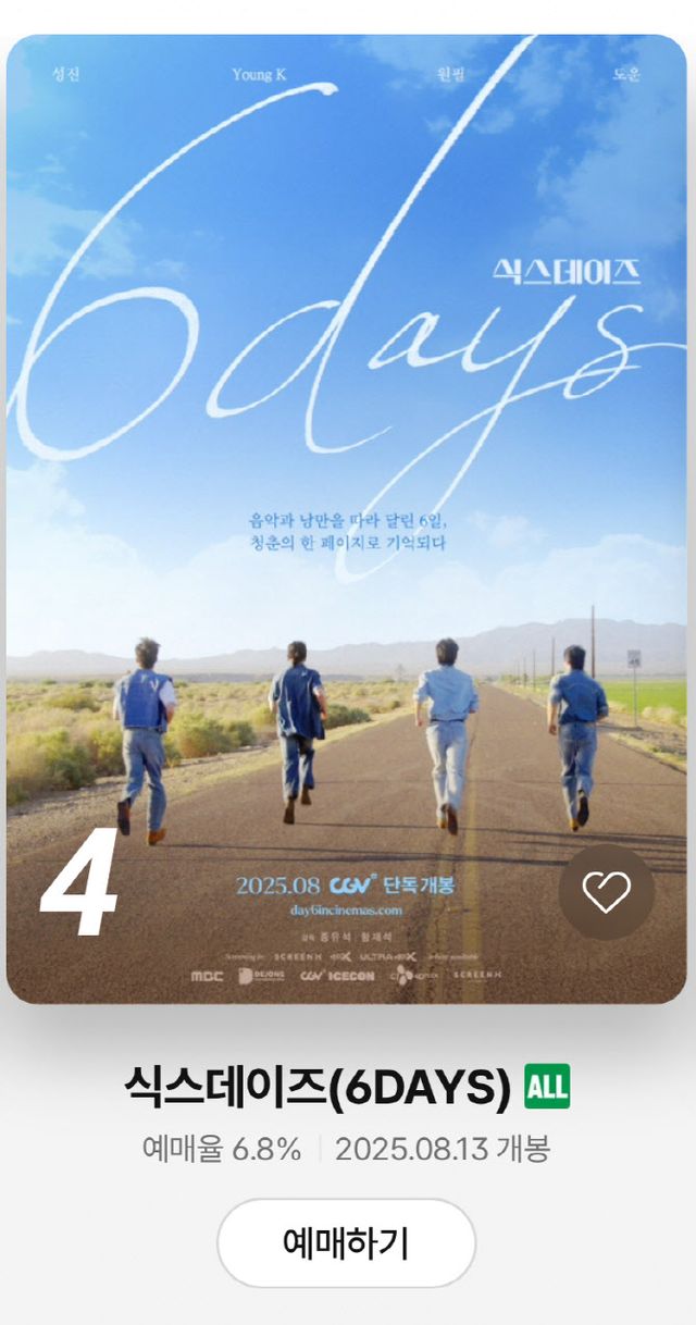 음악과 낭만을 따라 달린 6일, 데이식스의 시네마틱 여정을 담은 뮤직 로드무비 ‘식스데이즈’가 개봉을 5일 앞두고, 영화관입장권 통합전산망 전체 예매율 5위, CGV 전체 예매율 4위에 오르며 이목을 집중시킨다.