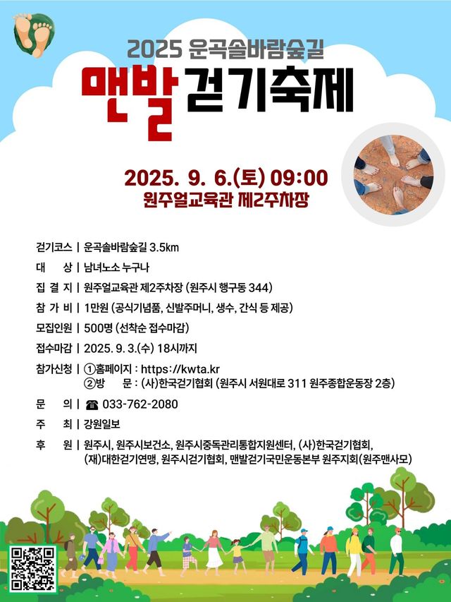 원주시는 ‘2025 운곡솔바람숲길 맨발 걷기 축제’가 9월 6일 열릴 예정이라고 8일 밝혔다. 축제는 약 1시간 30분 동안 운곡솔바람숲길을 맨발로 걷는 순환형 코스로 운영된다. 참가자들은 수만 그루 소나무에서 뿜어져 나오는 피톤치드를 온몸으로 느끼며 약 3.5km의 숲길을 걸을 수 있다. 숲길 인근에는 세족 시설, 신발장, 벤치 등 편의시설이 잘 갖춰져 있어 평소에도 시민들이 즐겨 찾는 명소로 손꼽힌다.