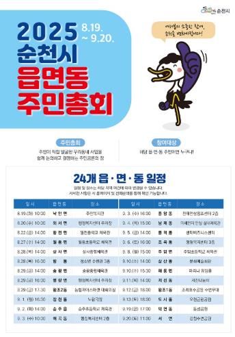 [파이낸셜경제=김영란 기자] 순천시는 주민 스스로 마을의 의제를 발굴하고 지역 문제 해결방안을 논의하는 ‘2025년 읍면동 주민총회’를 오는 8월 19일 낙안면을 시작으로 9월 20일까지 개최한다고 밝혔다.