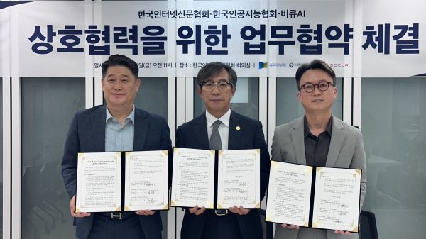 한국인터넷신문협회(이하 인신협)는 8일 한국프레스센터 내 협회 회의실에서 한국인공지능협회, 비큐AI와 ‘소버린 AI 구현을 위한 뉴스데이터 파이프라인 구축’에 관한 3자 전략적 업무협약(MOU)을 체결했다.