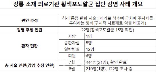 8일 강릉시 보건당국에 따르면 전날 18명이던 황색포도알균(MSSA) 감염 추정 사례가 이날 오전 8시 기준 총 22명으로 집계됐다. 총 22명 가운데 1명이 사망했고, 중환자실에 입원한 환자가 5명, 일반병실 입원한 환자가 12명이다. 4명은 퇴원했다. 22명의 환자 중 15명에게 황색포도알균 감염이 확인됐고, 나머지 7명은 조사 중이다.
