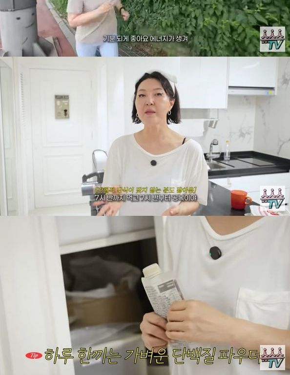 한혜연은 오후 7시 30분부터 공복 시간을 지니는 간헐적 단식을 하고 있다. 그는 "어저께도 7시 반까지 먹고 그때부터 공복"이라며 하루 한 끼는 단백질 파우더로 해결하는 식단 관리법을 공개했다.