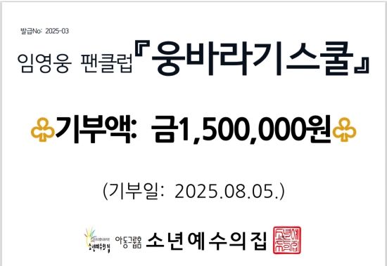 7일 임영웅 팬클럽 '잠실 웅바라기스쿨'은 지난 5일 서울 송파구 아동복지시설 ’소년예수의 집‘에 150만 원을 전달했다고 밝혔다.