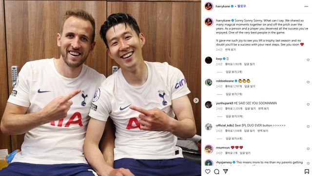 케인의 게시글에는 그가 토트넘에서 손흥민과 함께한 순간들이 담긴 사진들이 같이 올라왔다. 손흥민과 케인이 본격적으로 전성기에 접어든 2010년대 중반부터 지난 2023년 여름 케인이 바이에른 뮌헨으로 떠나기 직전에 발을 맞췄던 시절의 사진까지 볼 수 있었다.