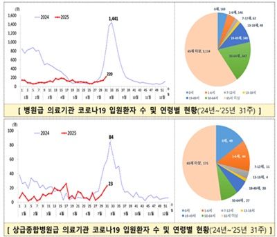 2025년 31주차(7월 27일~8월 2일) 코로나19 입원환자 표본감시 결과에 따르면, 병원급 의료기관 221개소의 입원환자 수는 220명을 기록했다.