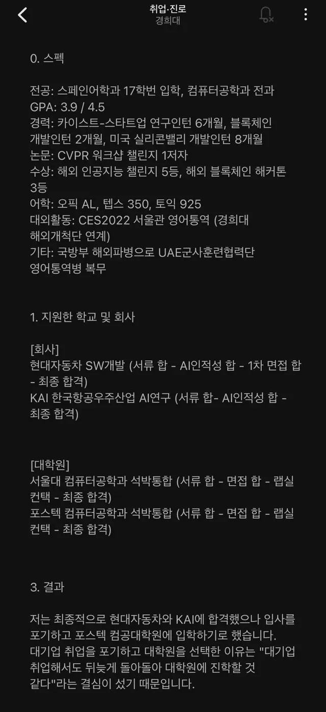 2년전에 현대차 합격했지만 버리고 포항공대 대학원 석박사과정으로 들어간 사람인데