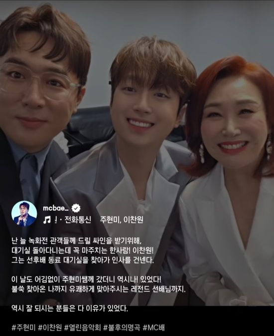 해당 영상은 KBS 1TV '열린음악회' 대기실에서 촬영된 것으로, 영상 속에는 MC배와 이찬원, 주현미가 등장해 인사를 건네고 있다. 배경 음악도 주현미와 이찬원이 함께 부른 '전화통신'.