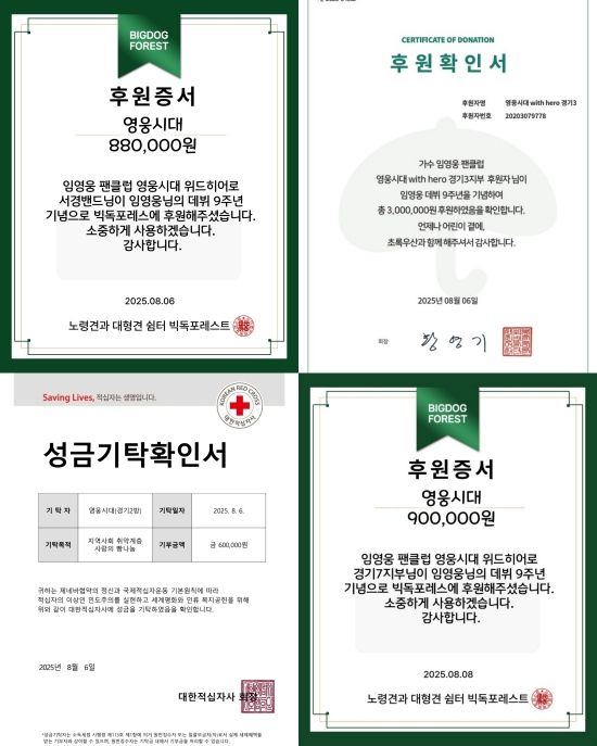 8일 임영웅 팬클럽 '영웅시대 with Hero 경기·서울'은 임영웅의 데뷔 9주년을 기념해 여러 단체에 기부하며 나눔을 실천했다고 밝혔다.