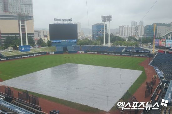 하지만, 9일 이른 오후부터 창원 지역에 비가 내리기 시작했다. 오후 2시부터 창원NC파크 그라운드 위에 대형 방수포가 깔렸다.