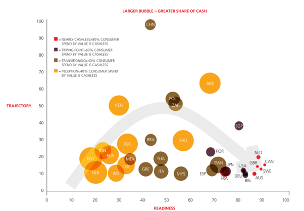 국제적인 신용카드 프랜차이즈인 마스터카드는 2013년에 '현금 없는 사회로의 여정'이라는 보고서를 통해서 주요한 국가의 신용카드 결제 현황을 분류했다. 해당 보고서는 아시아 일부, 라틴아메리카의 절반 이상의 국가 그리고 아프리카와 중동 지역 대다수 국가를 뺀 상태의 분석이기 때문에 매우 제한적인 분석이라 통합적인 분석이라 보긴 어렵다.