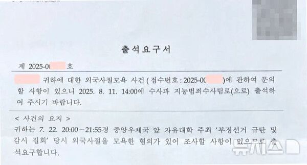 뉴시스 보도에 따르면, 9일 뉴시스 취재를 종합하면 서울 남대문경찰서는 외국사절모욕 혐의를 받는 자유대학 관계자에게 오는 11일 출석하라는 요구서를 보냈다.