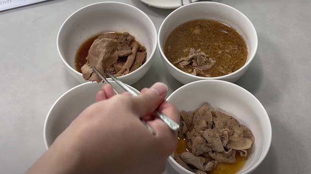 영상은 과일 양념의 연육 효과를 검증하는 실험으로 시작한다. 준비된 양념은 네 가지다. 파인애플 양념, 키위 양념, 배 양념, 그리고 과일을 넣지 않은 기본양념이다. 목표는 각 양념으로 고기를 재운 뒤 30분과 12시간 숙성 후 연육 정도를 비교하는 것. 실험에 사용한 고기는 돼지의 뒷다릿살. 후지는 질긴 부위다. 주로 탕수육, 만두 속, 또는 얇게 썬 불고기용으로 사용된다. 이 질긴 고기를 과일 양념으로 얼마나 부드럽게 만들 수 있을까.