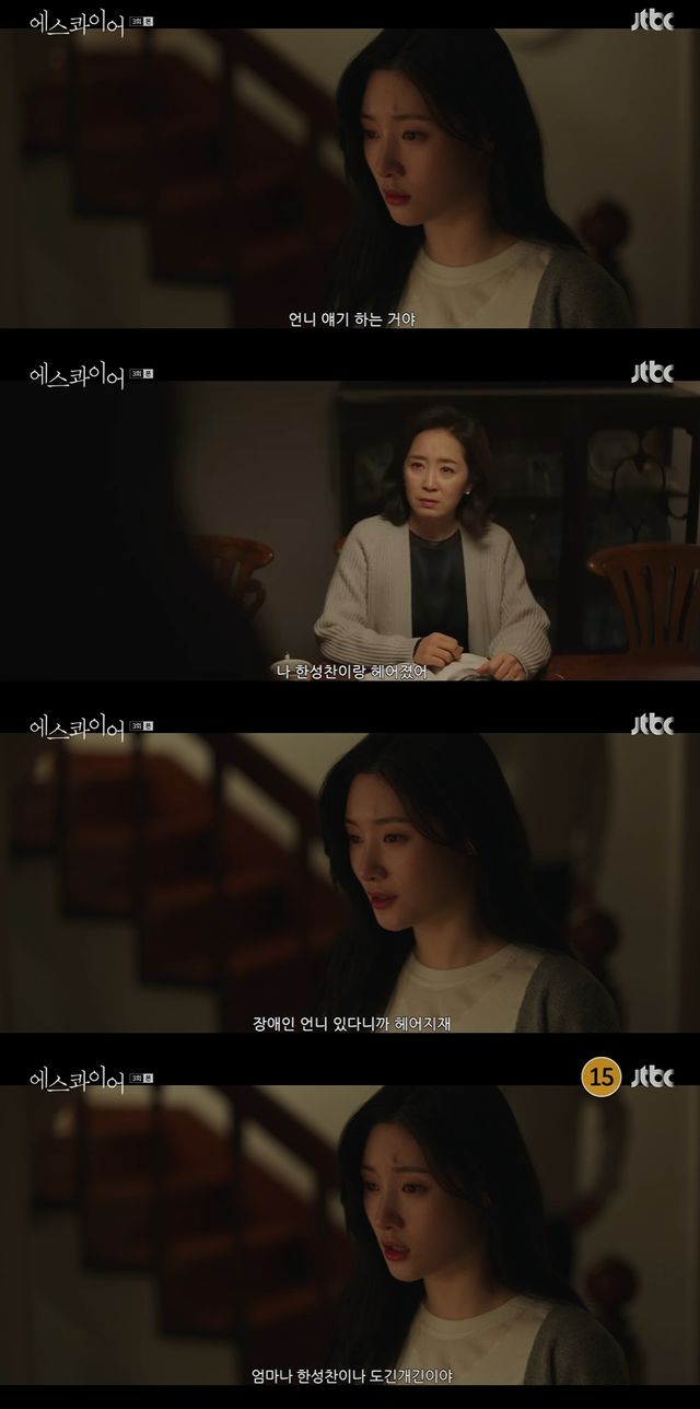 최은희는 "그릇 말하는 거야? 그릇 좋은 거 많은데 복 나가게 왜 이 나간 그릇을 써"라고 말했고, 강효민은 "아니. 그릇 말고. 언니 얘기하는 거야. 나도 장애가 있었으면 버렸겠지? 언니 버린 것처럼. 그릇 버리듯 그렇게. 나 한성찬이랑 헤어졌어. 장애인 언니 있다니까 헤어지재"라고 분노했다.