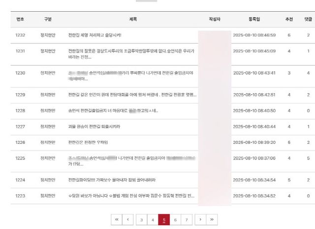 10일 정치권에 따르면, 국민의힘이 전씨에 대한 징계 절차에 착수하겠다고 발표한 9일 낮 12시 이후 국민의힘 홈페이지 내 당원게시판에는 이에 대한 찬성 또는 반대 관련 게시물이 거의 대부분이다. 당원들은 전씨 관련 게시물에 댓글까지 달며 지지·비판하고 있다.