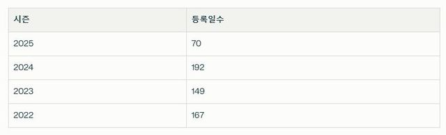 지난 7일 시즌 세 번째 햄스트링(허벅지 뒤 근육) 부상을 당한 김도영은 이튿날 1군 엔트리에서 빠졌다. 잔여 정규시즌 복귀가 어려워 그의 올해 1군 등록일수는 70일로 마무리될 가능성이 커졌다. 현행 KBO리그는 1군 등록 일수 145일을 채워야 한 시즌을 온전히 소화한 것으로 인정하는데 절반에도 이르지 못했다.