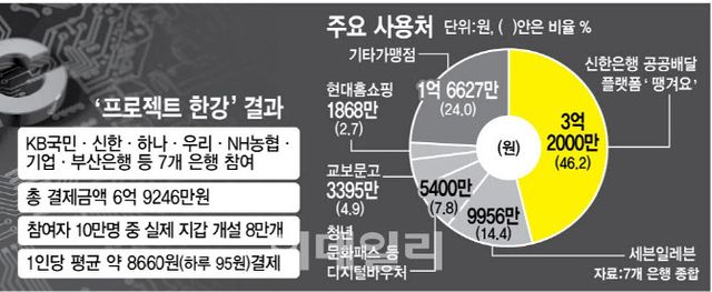 10일 금융권에 따르면 ‘프로젝트 한강’에 참여한 7개 은행에서 실험에 참여한 10만명(만 19세 이상 국민)이 실제 개설한 전자지갑 수는 약 8만개로 총 결제액은 6억 9246만원으로 집계됐다. 실제 전자지갑을 만든 전체 80% 참여자들의 1인당 평균 예금토큰 결제액은 8660원으로 실험기간 3개월간 하루 95원씩 쓴 셈이다.