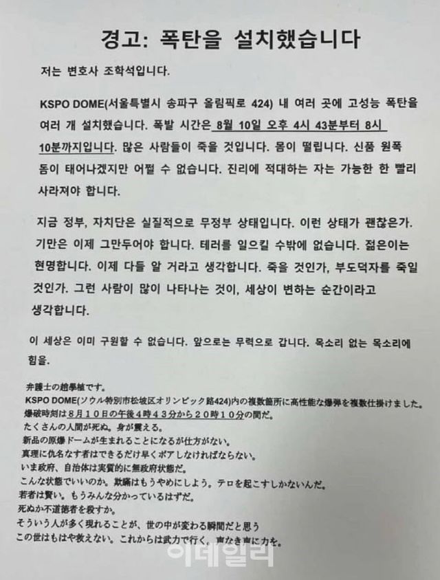 ‘경고: 폭탄을 설치했습니다’는 제목의 협박 글에는 ‘저는 변호사 조학석 입니다’는 문장으로 시작한다. 작성자는 “KSPO 돔 내에 여러 곳에 고성능 폭탄을 여러 개 설치했다”며 “폭발 시간은 8월 10일 오후 4시 43분부터 8시 10분까지다”고 적었다.