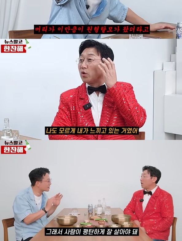 이어 "그 당시에 내가 잘못한 걸 잊고 열심히 살아야지 하면서 '인규야, 형 괜찮아' 하고 딱 도는데 뒤가 이상하다더라. 머리가 이만큼이 원형탈모가 왔었다"며 본인도 모르게 탈모가 왔음을 고백했다.