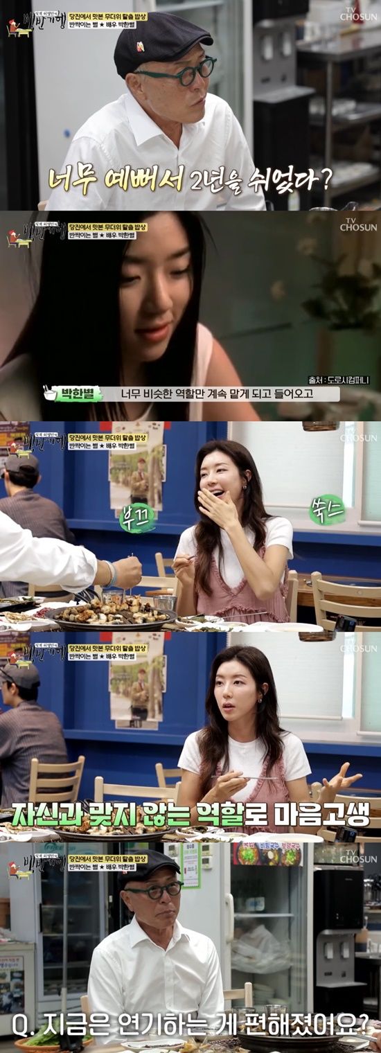 이에 박한별은 "데뷔를 했는데 매번 비슷한 역할만 하게 되더라. 집에 힐이 하나도 없는데 힐만 신고 다니는 역만 하게 되더라. 연기도 잘 못하겠고 너무 힘들더라"라고 설명했다.
