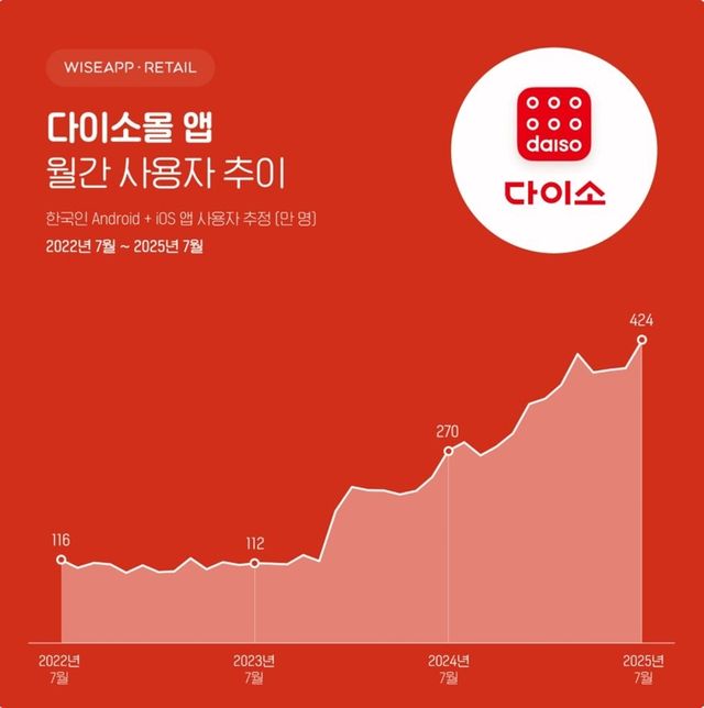 와이즈앱·리테일에 따르면 한국인 스마트폰 사용자를 표본 조사한 결과 2025년 7월 다이소몰 앱의 월간 활성 사용자 수는 424만 명을 기록한 것으로 나타났다. 이는 지난해 동월 270만 명 대비 무려 57% 증가해 역대 최대치를 경신한 것으로 조사됐다.