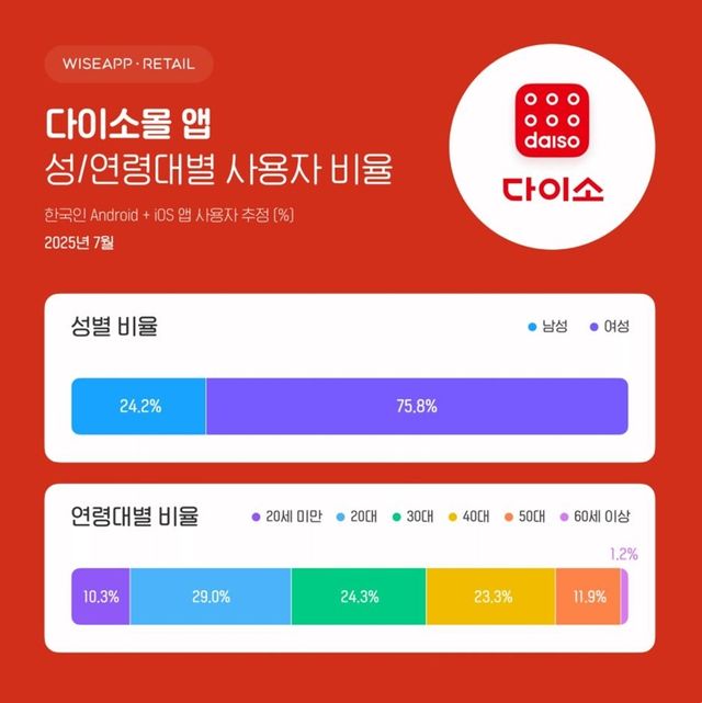 다이소몰 앱의 성별 사용자 비율은 여성이 75.8%(321만 명), 남성이 24.2%(103만 명)를 각각 차지하는 것으로 나타났다. 다이소몰 앱의 주요 사용자 연령층은 20대부터 40대인 것으로 조사됐다. 연령대별 비율을 살펴보면 20세 미만이 10.3%(44만 명), 20대 29.0%(123만 명), 30대 24.3%(103만 명), 40대 23.3%(99만 명), 50대 11.9%(50만 명), 60세 이상 1.2%(5만 명)로 각각 나타났다. / 시장 분석 솔루션 업체 와이즈앱·리테일 제공