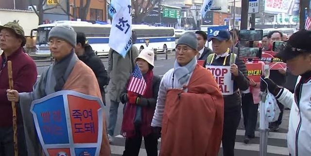 '빨갱이는 죽여도 돼'라는 문구가 쓰여진 방패를 들고 행진하는 성호 스님의 모습. <사진=JTBC 캡처>
