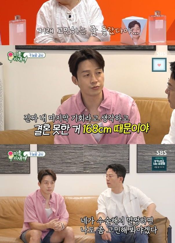 김준호는 "그래도 얼굴이 배우상이지, 그리고 돈도 벌었지, 개그도 어느 정도 하지. 너는 키만 있으면 된다. 다 가졌는데 키만 없다"면서 "네가 수술해서 멀쩡하면 나도 고민해 봐야겠다. 50까지는 169cm로 살았지만 나도 175cm로 살아보고 싶다"고 밝혔다.