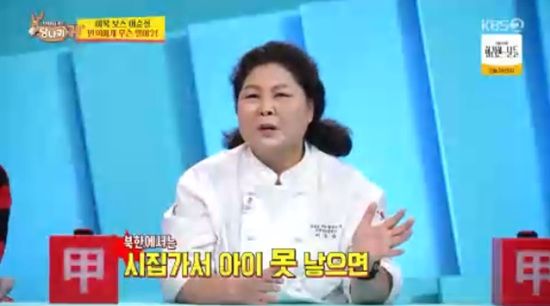 (엑스포츠뉴스 원민순 기자) 이순실이 북한에서는 아이를 못 낳으면 쫓겨난다고 밝혔다.