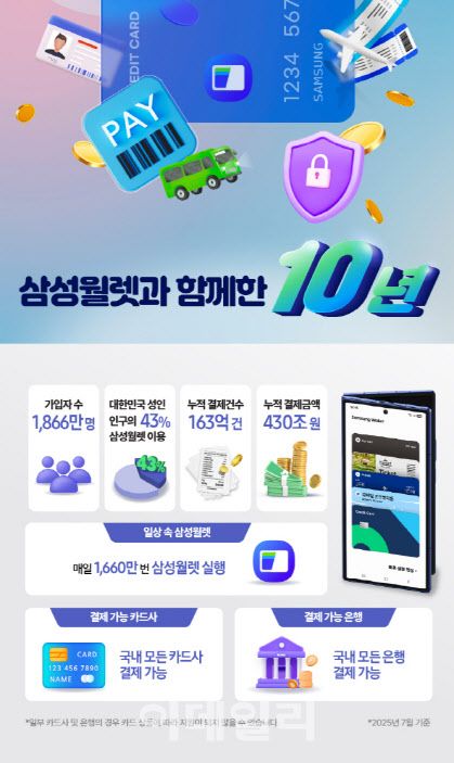 삼성전자는 삼성월렛이 2015년 출시 이후 2014년까지 누적 결제금액 430조원을 달성했다고 11일 밝혔다. 현재 기준 가입자는 1866만명으로 초기 160만명에서 10년간 약 11배 증가했다.