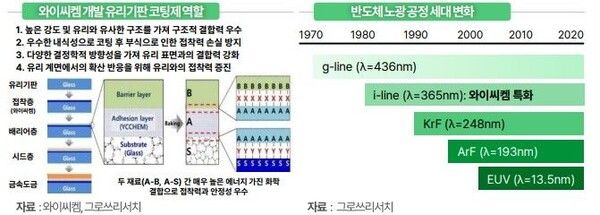 이어 "와이씨켐은 유리기판 회로 형성(RDL) 공정에서 사용되는 핵심 소재 3종(감광액·현상액·박리액)을 모두 국내 메이저 고객사에 공급하는 드문 기업"이라며 "이 가운데 핵심은 300~400nm 파장의 i-Line 광원 전용 감광액으로, 동사는 과거부터 i-Line 광원 기반 반도체 노광 소재를 개발·공급해왔다"고 설명했다.